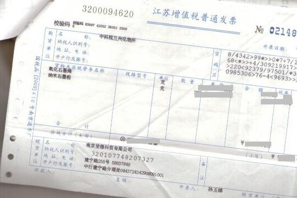 我司是我國(guó)最早推出石墨烯產(chǎn)品的公司之一,客戶主要是各大高校和中科院所及英國(guó)、美國(guó)、韓國(guó)、臺(tái)灣高校。廣大客戶對(duì)我司產(chǎn)品給予廣泛的好評(píng)。 為了增進(jìn)新客戶對(duì)我司的了解,特選一小部分發(fā)票公布。