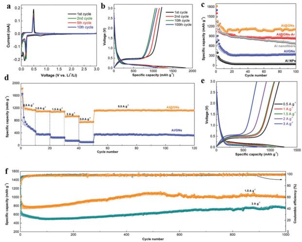 Figure 3. LIBs中Al@GNs電極的電化學(xué)性能。(a)Al@GNs電極最初十個循環(huán)的循環(huán)伏安圖,掃描速率為0.1 mV/s;(b)0.5 A/g下,所選循環(huán)的恒電流放電-充電曲線;(c)在0.5 A/g下,Al@GNs電極上的循環(huán)性能,包括Al@GNs-Ar、Al納米纖維、Al NPs和Al/GNs用于比較;d)Al@GNs電極的倍率性能,其電位曲線如(e)所示;(f)Al@GNs電極在1.5和3 A/g下的循環(huán)性能。