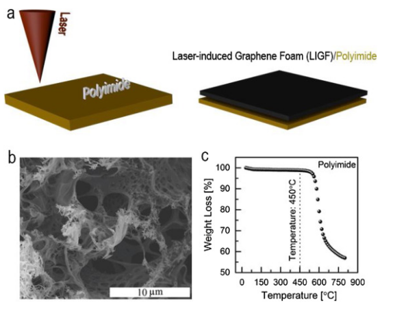 Fig. 1. (a)LIGF生長(zhǎng)示意圖,(b)LIGF的泡沫像形態(tài),(C)直到450℃,聚酰亞胺穩(wěn)定。