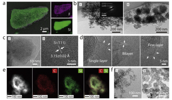 將硅顆粒封裝在導電層中,已被證明是在循環(huán)過程中保持高容量硅的有效途徑。在這里,通過硅-聚四氟乙烯(PTFE)高能材料的核-殼結構設計,本文展示了一種大型自上而下的方法,以微米大小的PTFE和Si粒子作為低成本的初始材料,直接獲得包覆Si納米顆粒的石墨烯納米薄片(GrSiNPs)。在爆燃過程中,PTFE與Si之間放熱反應產(chǎn)生的高溫高壓導致Si核碎裂成納米顆粒,在此過程中,Si納米顆粒與石墨烯納米薄片形成了相應的涂層。在400 mA g−1的電流密度下重復循環(huán)6個月,在800次循環(huán)后,GrSiNPs表現(xiàn)出1613 mAh g−1的高比容量,平均庫侖效率為101±2%。本研究為高性能鋰離子電池用核殼結構石墨烯-Si納米復合材料的大規(guī)模生產(chǎn)提供了一條有前景的途徑。 Fig. 1.石墨烯納米片封裝Si納米顆粒的制備工藝。a,i-ii:PTFE-MPs在乙醇溶液中分散成納米厚度的PTFE-NPs;iii-iv:PTFE-NPs包覆SiMPs形成PTFE-Si EMs;b,通過PTFE和Si之間的放熱反應直接生產(chǎn)GrSiNPs,自由絞合GNs和氣態(tài)SiF4。