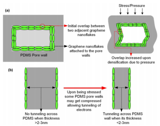Figure 3. 石墨烯-PDMS泡沫傳感器中可能的應變誘導電阻調(diào)制機制的示意圖:(a)傳感器中觀察到的應變誘導電阻調(diào)制的導電域斷開機制的示意圖;(b)應力誘導隧穿電阻調(diào)制的示意圖。