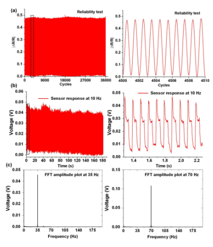 Figure 5. 循環(huán)壓縮加載和動態(tài)應變傳感特性的石墨烯泡沫塑料傳感器:(a)傳感器在5%壓縮應變下對循環(huán)加載和卸載的響應;(b)傳感器在10 Hz時時域響應的曲線圖;(c)在35 Hz和70 Hz時傳感器響應的FFT振幅圖。