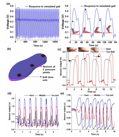 Figure 6. 石墨烯- PDMS泡沫傳感器在人體步態(tài)監(jiān)測中的應用:(a)傳感器對模擬步態(tài)的響應圖;(b)軟鞋底傳感器組件(SSA)示意圖;(c)顯示步行時腳趾球和腳后跟區(qū)域的傳感器響應圖;(d)顯示跑步時腳趾球、足弓和腳后跟區(qū)域的傳感器響應圖;(e)顯示周期性前后傾時腳趾球、足弓和腳跟區(qū)域的傳感器響應。