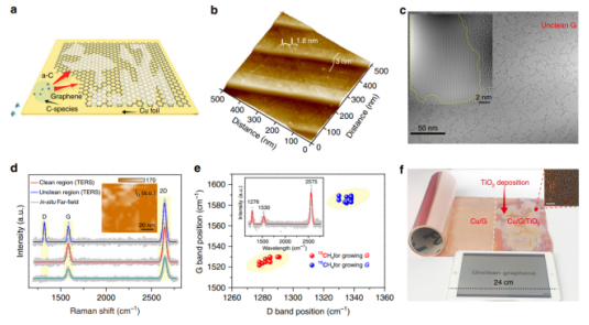 Figure 1. (a)石墨烯CVD生長期間,sp2鍵合石墨烯的形成與富缺陷的無定形碳(a-c)之間的競爭;(b)生長后在銅箔上新鮮制備的石墨烯的AFM圖像;(c)通常生長的石墨烯表面的TEM圖像;插圖:具有原子分辨率的干凈和受污染區(qū)域的HRTEM圖像;(d)使用Lorentzian線擬合分析不干凈石墨烯樣品中不干凈(藍(lán)線)和干凈(紅線)石墨烯區(qū)域的TERS光譜,以及同一區(qū)域(暗青色線)中石墨烯的原位遠(yuǎn)場拉曼光譜;插圖:平滑后D波段強(qiáng)度的TERS映射;(e)來自正常甲烷(藍(lán)色)和13C標(biāo)記甲烷(紅色)生長的石墨烯受污染區(qū)域的D和G帶位置的統(tǒng)計數(shù)據(jù);插圖:同位素標(biāo)記石墨烯的代表性TERS光譜;(f)TiO2可視化后的0.3 m×1-m大小的不清潔石墨烯的照片,iPad被用作尺寸參考;插圖:TiO2顆粒修飾的石墨烯表面的暗場光學(xué)顯微鏡(OM)圖像;比例尺:100μm。