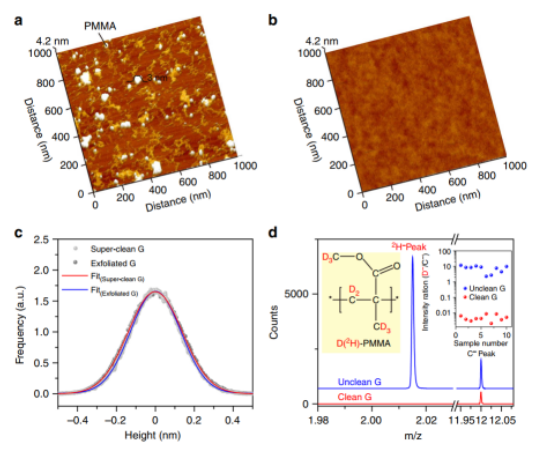 Figure 3. 轉(zhuǎn)移到目標(biāo)基材上后,石墨烯表面非常干凈:在SiO2/Si襯底上轉(zhuǎn)移的(a)不清潔石墨烯和(b)的AFM圖像;(c)SiO2基材上超潔凈石墨烯(灰色,紅色線)和片狀石墨烯(黑色,藍(lán)色線)的高度直方圖,超清潔石墨烯的數(shù)據(jù)是從(b)圖中獲得的;(d)去除2H-PMMA后,SiO2/Si襯底上轉(zhuǎn)移的超凈(紅線)和受污染的石墨烯(藍(lán)線)的ToF-SIM光譜圖;插圖(左):2H-PMMA的結(jié)構(gòu)式;插圖(右):從ToF-SIMS結(jié)果獲得的超凈(紅色)和受污染的石墨烯(藍(lán)色)的2H-峰強(qiáng)度的統(tǒng)計數(shù)據(jù)。