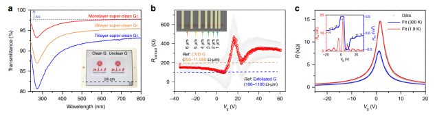 Figure 4. 超清潔石墨烯的光電性能:(a)石英襯底上單層、雙層和三層超凈石墨烯薄膜的紫外可見光譜;插圖:將大面積超清潔石墨烯和不清潔石墨烯轉(zhuǎn)移到PET基材上的照片,iPad用作尺寸參考;(b)測得的接觸電阻與柵極電壓的關(guān)系;(c)石墨烯電阻隨柵極電壓(Vg)變化的典型曲線圖;插圖:在1.9 K下,磁場強(qiáng)度為5 T時,超潔凈石墨烯的縱貫(Rxx,紅線)和霍爾電阻(Rxy,藍(lán)線)。