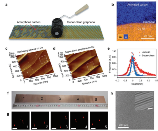 Figure 1. 超凈石墨烯經(jīng)活性碳涂層皮棉輥處理:a)涂有活性炭的皮棉輥用于清潔石墨烯表面的示意圖;b)活性炭和石墨烯之間接觸面的截面EDS圖;銅箔上c)不清潔和d)超清潔石墨烯的AFM圖像;e)不清潔石墨烯和超清潔石墨烯高度分布的直方圖分別對(duì)應(yīng)于(c)和(d)中的虛線框;f,g)通過選擇性沉積TiO2顆粒(g中的白點(diǎn))大面積觀察獲得的超凈石墨烯;比例尺:50 µm;h)清潔表面的HR-TEM圖像;插圖:超凈石墨烯的晶格圖像;比例尺:2 nm。