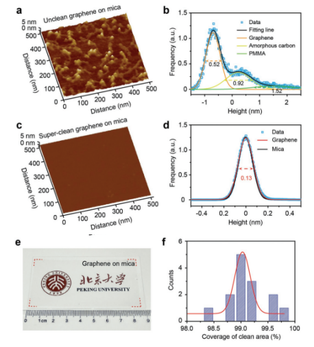 Figure 2. 石墨烯轉(zhuǎn)移后聚合物殘留的抑制:a)云母基底上不潔凈石墨烯的AFM圖像和b)相應(yīng)的高度分布;c)云母基板上獲得的超凈石墨烯的AFM圖像和d)相應(yīng)的高度分布;e)將獲得的大面積超凈石墨烯薄膜轉(zhuǎn)移到約4英寸大小的云母基底上;f)轉(zhuǎn)移的超凈石墨烯的清潔度直方圖。