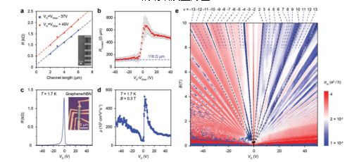 Figure 3. 所獲得的超凈石墨烯的優(yōu)異電子性能:a)源極漏極電阻與溝道長(zhǎng)度的關(guān)系;插圖:經(jīng)TLM測(cè)量的石墨烯晶體管陣列的SEM圖像,比例尺:2 µm;b)接觸電阻與柵極偏置的關(guān)系;c)hBN封裝的超純石墨烯的電阻率在T = 1.7 K時(shí)隨柵極電壓(VG)的變化;插圖:封裝石墨烯的霍爾棒器件的光學(xué)顯微鏡圖像;d)霍爾遷移率與背柵電壓(VG)的關(guān)系;e)(c)中器件的縱向電導(dǎo)率(σxx)與磁場(chǎng)B和VG的關(guān)系。