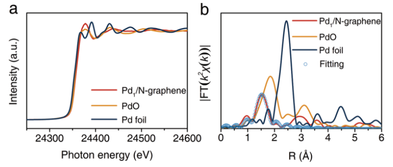 Figure 2. Pd1/N-石墨烯、PdO和Pd箔a)Pd K邊緣的XANES光譜、b)Pd K邊緣EXAFS光譜的k