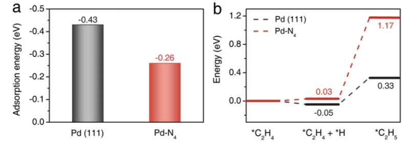 2氫化的選擇性,實現(xiàn)了99%的乙炔轉(zhuǎn)化率和在125°C下對乙烯的選擇性為93.5%。這種出色的催化性能歸因于催化劑表面上高濃度的Pd活性位點和乙烯在分離的Pd原子上的弱吸附能,從而阻止了C