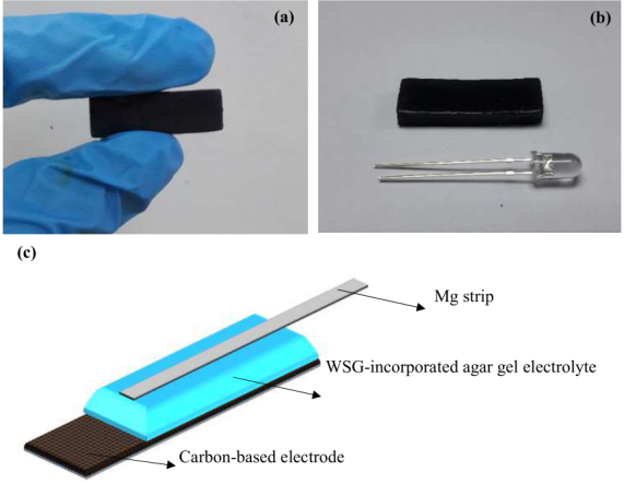 Figure 1. (a)WSG結(jié)合的瓊脂凝膠電解質(zhì)長方體圖;(b)與發(fā)光二極管(LED)相比,用于電池組裝的凝膠電解質(zhì)的尺寸相對較小;(c)層狀結(jié)構(gòu)的全固態(tài)鎂空氣電池示意圖。