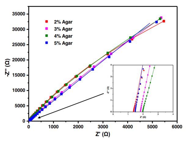 Figure 3. 含有不同量瓊脂的瓊脂凝膠電解質(zhì)的交流阻抗譜(插圖:在高頻區(qū)域的展開圖)