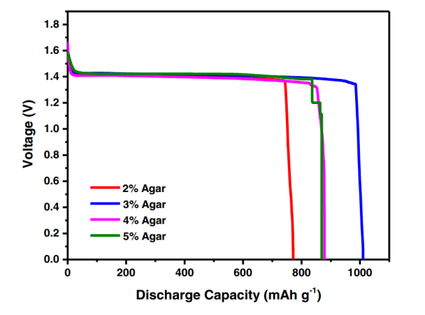 -1。組裝的Mg-空氣電池相對于Mg的放電容量和能量密度分別可以達到1010.60 mAh/g和1406.09 mWh/g。就層壓結(jié)構(gòu)的小面積、尺寸和厚度而言,組裝的鎂-空氣電池的性能是顯著的??傊?,摻有WSG的3%w/v瓊脂凝膠電解質(zhì)表現(xiàn)出最高的電化學(xué)性能,這是一種經(jīng)濟、固有安全且對環(huán)境有益的鎂空氣電池生物聚合物電解質(zhì)。