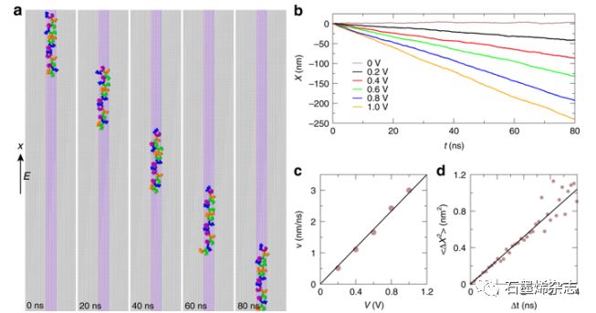 Fig. 3 ssDNA在石墨烯/h-BN/石墨烯異質(zhì)結構上的電泳轉(zhuǎn)運。(a)不同時間ssDNA電驅(qū)動運動示意圖(V = 0.2 V)。(b) ssDNA在各種外部偏置電壓下的時變位移。(c)不同偏置電壓下ssDNA的平均速度。(d)當V = 0 V時,ssDNA在不同時間間隔的均方位移。