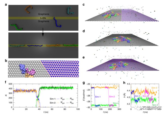 Fig. 1 2D材料上的ssDNA動力學:石墨烯、h-BN及其平面內(nèi)異質(zhì)結構。(a)關于如何在平面內(nèi)石墨烯/h-BN/石墨烯異質(zhì)結構上自發(fā)拉伸ssDNA的說明。(b)石墨烯/h-BN邊界附近的ssDNA片段放大圖。(c-e) ssDNA在石墨烯/h-BN異質(zhì)結構、石墨烯和h-BN上的模擬系統(tǒng)。(f)在模擬過程中,石墨烯/h-BN異質(zhì)結構中在ssDNA 3.5 Å以內(nèi)的原子數(shù)。(g) ssDNA與不同2D材料之間的范德華相互作用能(每個核苷酸)。(h) ssDNA(質(zhì)心)在不同2D材料上的高度。