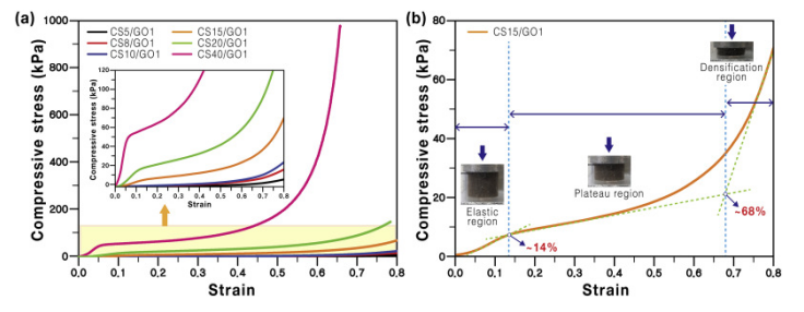 Fig. 4. (a)使用0至80%應(yīng)變范圍內(nèi)的各種CS濃度(5、8、10、15、20和40μmg/ mL)制備的CS/GO泡沫的單軸壓縮應(yīng)力-應(yīng)變曲線。(b) CS15/GO1的應(yīng)力-應(yīng)變曲線。