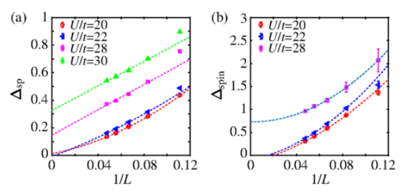 FIG. 3. (a)1/L外推單粒子間隙Δsp(K),該間隙在U/t=22和U/t=28之間。(b)自旋間隙的1/L外推量Δspin(K),自旋間隙與單粒子間隙同時(shí)打開,作為pVBS階的建立。