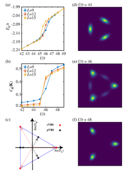 FIG. 4. (a)在大的U值下,系統(tǒng)的每個(gè)位置的動(dòng)能。(b) CB(K)對(duì)于相同的過程,VBS順序也發(fā)生了跳躍,表明這是不同VBS相之間的轉(zhuǎn)變。(c)復(fù)序參數(shù)DK的角度相關(guān)性。(d)-(e)不同交互強(qiáng)度下DK的直方圖U<UVBS, U≈UVBS, U>UVBS。