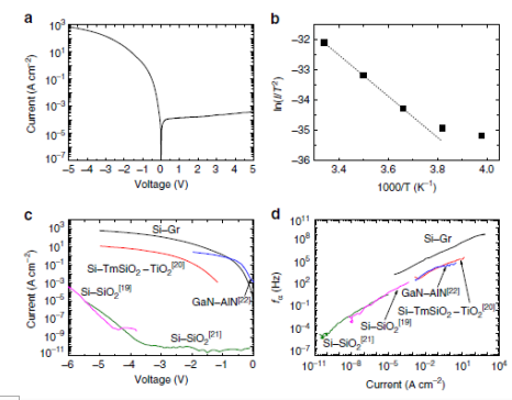 Figure 2. Si-Gr-Ge晶體管的肖特基發(fā)射結(jié)。(a)Si-Gr發(fā)射結(jié)在室溫下的I-V曲線,(b)電流-溫度相關(guān)曲線,(c)不同發(fā)射結(jié)情況下石墨烯基晶體管的電流比較,(d)不同發(fā)射結(jié)情況下石墨烯基晶體管的fa比較。