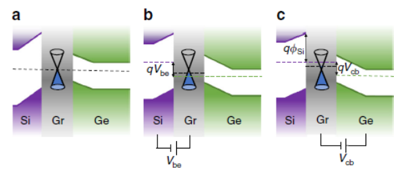 Figure 4. Si-Gr-Ge晶體管的能帶圖。(a)無施加偏壓下的能帶圖,(b)給發(fā)射結(jié)施加一個大于零的正向偏壓時的能帶圖,(c)給集流體結(jié)施加一個大于零的反向偏壓時的能帶圖。?