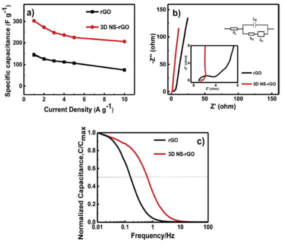 Figure 4.(a)3D NS-rGO電極,(b)rGO在不同掃速下的CV曲線,(c)兩種電極在10 mV s-1固定掃速下的CV曲線比較,(d)3D NS-rGO電極在不同電流密度下的恒電流充放電曲線,(e)兩種電極在1 A g-1固定電流密度下的恒電流充放電曲線。