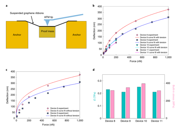 Fig. 3:附有檢測(cè)質(zhì)量的懸浮石墨烯帶的靜態(tài)力學(xué)表征。