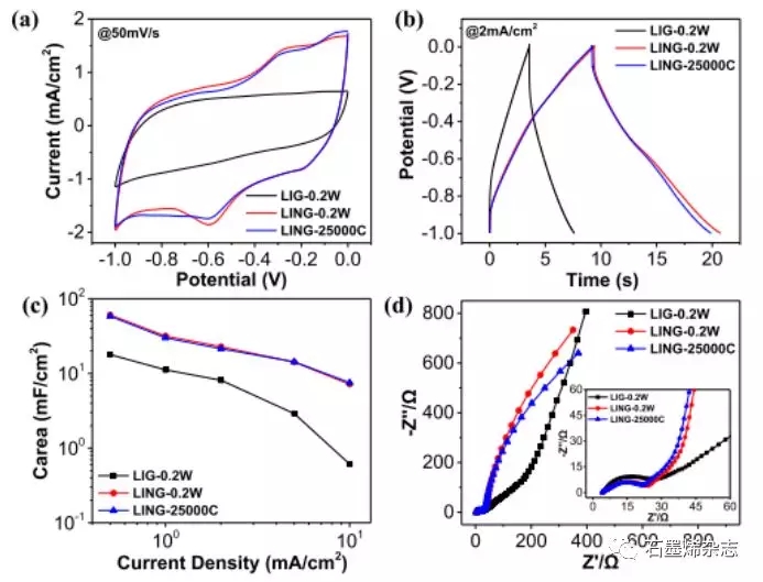 Figure 4. LIG-0.2W和LING-0.2W電極在0.1 M Na2SO4溶液中的電化學(xué)性能表征。(a)CV曲線,(b)GCD曲線,(c)不同電極的比電容值比較,(d)電化學(xué)阻抗譜比較。