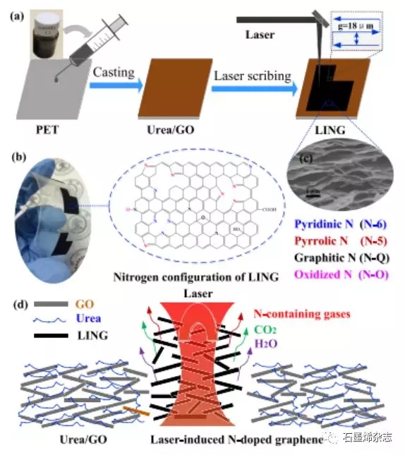 Figure 1.(a)通過(guò)激光誘導(dǎo)合成LING材料的原理示意圖,(b)LING電極粘結(jié)在柔性PET基底上的光學(xué)照片,(c)LING薄膜的橫截面SEM圖,呈現(xiàn)了一個(gè)多孔的三維結(jié)構(gòu),(d)LING納米片衍生于GO/尿素混合物,在激光照射下有更大的晶面間距。