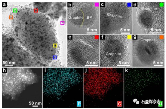 Figure 4. (a)100次循環(huán)后BP-G/PANI的TEM圖。(b-g) HRTEM圖像。(h-k)經(jīng)過(guò)100次循環(huán)后的BP-G/PANI元素分布圖。
