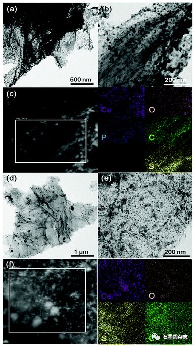 Fig. 3 S@CeO2/PG和S@CeO2/G復(fù)合材料的形態(tài)及元素分布。 S@CeO2/PG復(fù)合材料的(a, b) TEM圖和(c) EDX圖,S@CeO2/G復(fù)合材料的(d,e) TEM圖和(f) EDX圖。