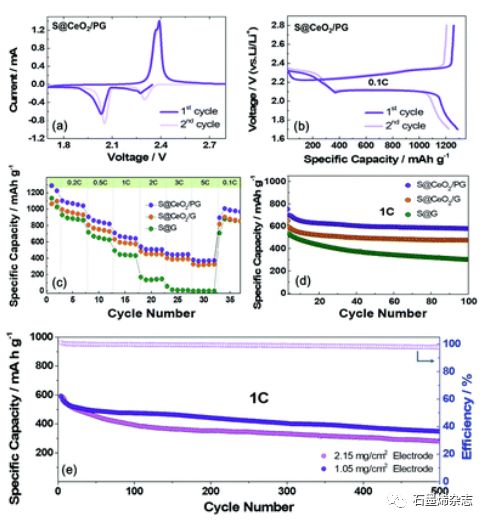 Fig. 6 S@CeO2/PG電極的電化學(xué)性能。(a) S@CeO2/PG電極的CV圖(0.1C,1.7-2.8V),(b) 0.1 C時S@CeO2/PG電極的充放電曲線,(c)不同電流密度下S@CeO2/PG、S@CeO2/G、S@G電極的倍率性能,(d) S@CeO2/PG、S@CeO2/G、S@G電極在1C下的循環(huán)穩(wěn)定性,(e)1C下不同負(fù)載量的S@CeO2/PG電極的循環(huán)性能和庫侖效率。