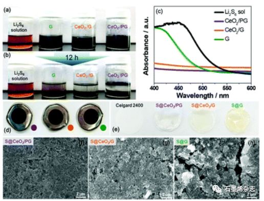 Fig. 7 CeO2/PG復(fù)合材料對多硫化物的吸附能力。(a, b)添加CeO2/PG、CeO2/G、G后Li2S6溶液的顏色變化,(c) 吸附Li2S6 12小時后的UV曲線, (d, e) 1C循環(huán)100次后電極和隔膜的數(shù)碼照片,(f, g, h) S@CeO2/PG、S@CeO2/ g和S@G循環(huán)后電極的SEM圖。