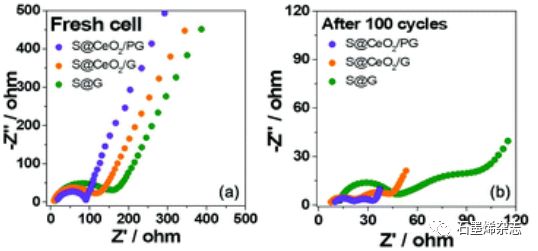 Fig. 8 電化學(xué)阻抗譜圖。(a)初始電池和(b)循環(huán)100次后的 S@CeO2/PG、S@CeO2/G、S@G電極的EIS圖。