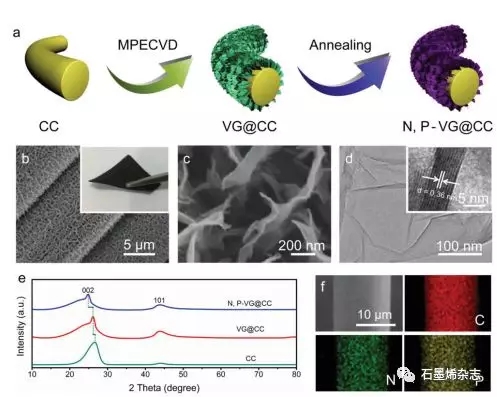Figure 1. N, P-VG@CC的 a) 合成方法示意圖,b)低倍SEM圖,c)高倍SEM圖,d)TEM圖和f) C,N,P的元素映射圖。(b)和(d)中的插圖為 N, P-VG@CC的數(shù)碼照片和對應的HRTEM圖像。e) CC, VG@CC, 和N, P-VG@CC 的XRD圖譜。