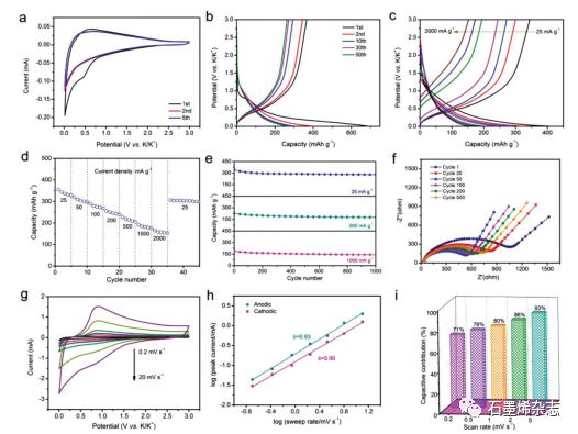Figure 3.N, P-VG@CC作為KIBs陽極在半電池中的電化學性能。a)CV曲線;b)不同循環(huán)次數(shù)及c)不同倍率的的恒電流充放電曲線;不同電流密度下的d)倍率性能和e)循環(huán)性能;f) Nyquist 圖;g)不同掃描速率的CV曲線; h) 根據(jù)(g)中的CV曲線計算的峰值電流與掃描速率曲線圖;i)不同掃描速率下表面驅(qū)動力。