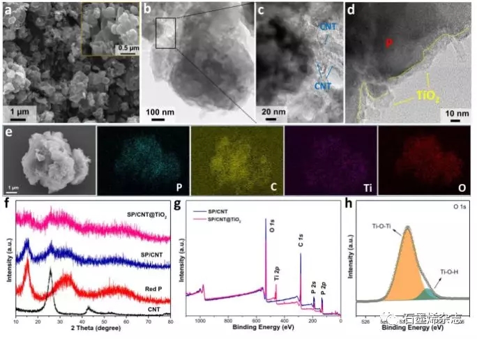 Figure 1. SP/CNT@TiO2的(a)SEM圖,(b-c)TEM圖,(d)HRTEM圖,(e)EDS元素漫譜圖,(f)SP/CNT@TiO2, SP/CNT, 紅磷 和CNT的XRD圖,(g)SP/CNT@TiO2和 SP/CNT的XPS譜,(h) O 1s高分辨XPS譜。