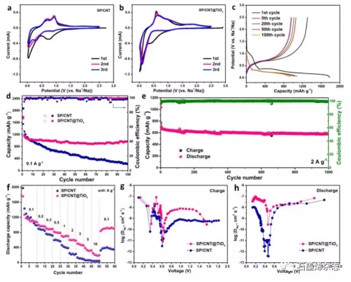 Figure 2. SP/CNT@TiO2 和 SP/CNT陽極的電化學(xué)性能表征。(a,b) SP/CNT 和SP/CNT@TiO2 在掃速為0.1 mV s-1時(shí)的第三圈CV曲線,(c)SP/CNT@TiO2在不同掃描圈數(shù)下的充放電曲線,(d)比電容和庫倫效率,(e)長時(shí)間的循環(huán)穩(wěn)定性測試(循環(huán)1000圈),(f)倍率性能比較, SP/CNT 和SP/CNT@TiO2 在(g)放電和(h)充電期間的Na離子擴(kuò)散系數(shù)比較。