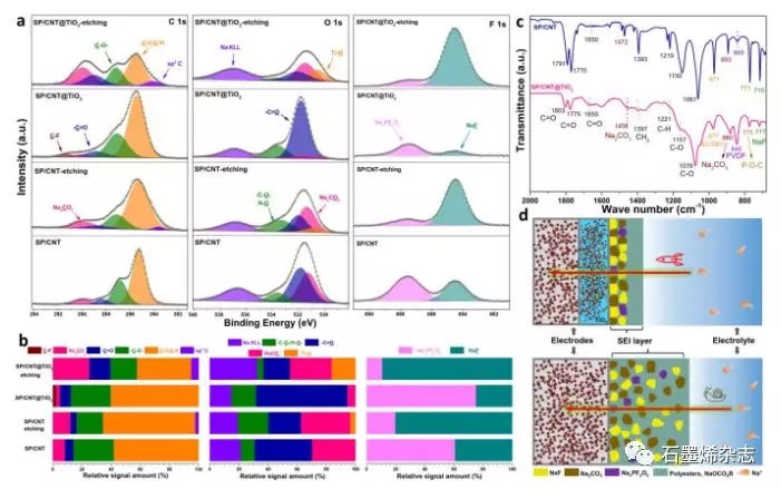 Figure 4. 不同SEI層的組成成分分析。(a)三種元素(C1s, O1s, 和 F1s)的高分辨XPS圖譜,(b)來源于三種元素(C1s, O1s, 和 F1s)不同峰的信號相對含量,(c)SP/CNT 和SP/CNT@TiO2電極在10圈以后的FT-IR分析,(d)SEI的不同組分示意圖及其在鈉儲存系統(tǒng)中的貢獻(xiàn)。
