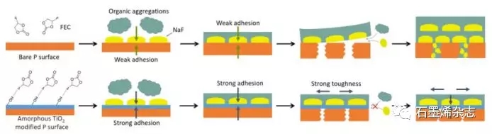 Figure 5.在體積膨脹時(shí),有/無非晶TiO2保護(hù)層情況下的SEI薄膜演變過程。