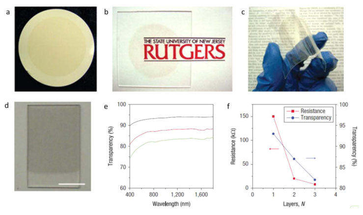 Figure 5. (a–c)固溶GO薄膜;GO薄膜在(a)濾膜上,轉(zhuǎn)移到(b)玻璃和(c)PET基材上的光學(xué)圖像;(d–f)用LB方法制造的石墨烯片(GS)膜的表征