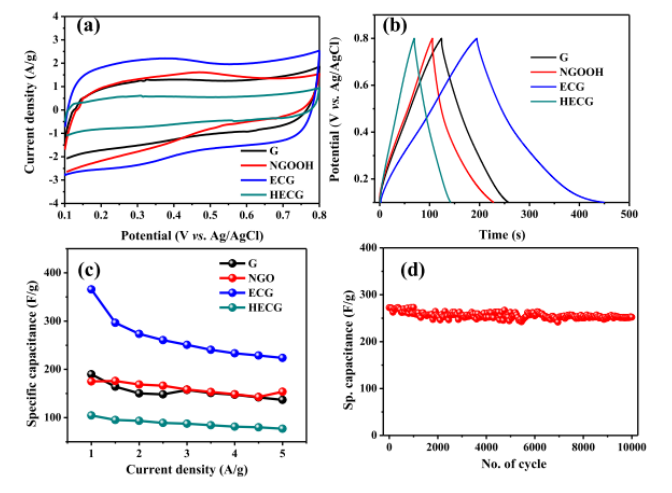 Figure 4.不同電極材料在1 M H2SO4電解液中的CVs曲線,掃速為20 mV s-1,(b)恒電流充放電曲線,電流密度為1 A g-1,(c)比電容與電流密度的關(guān)系,以評估倍率特性,(d)ECG的穩(wěn)定性測試,在三電極體系中2 A g-1電流密度下循環(huán)10000圈。