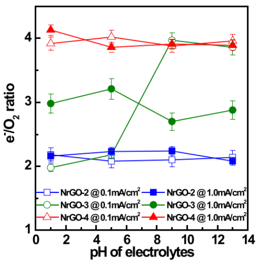Figure 2. 三種NrGO催化劑的電子轉(zhuǎn)移數(shù)(e-/O2)作為pH的函數(shù)關(guān)系(在低過電位和高電位情況下)。