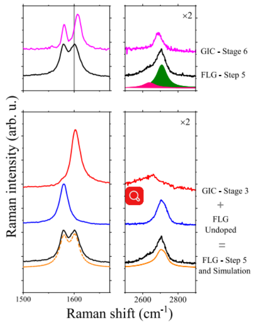 Figure 3.上圖:?jiǎn)尉珦诫s到臺(tái)階6和FLG摻雜到步驟5的比較,下圖:FLG摻雜到步驟5的Raman光譜的分解圖,此時(shí)是臺(tái)階3 GIC摻雜和未摻雜FLG材料的混合物。