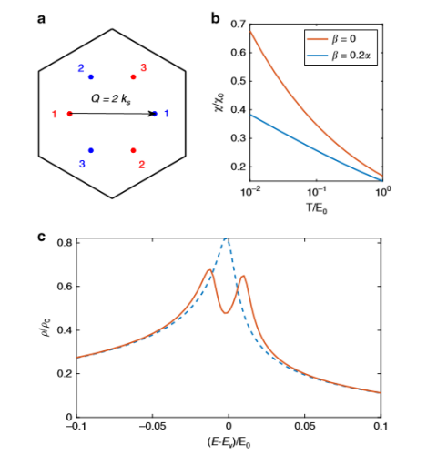 Fig. 4 雙分子層石墨烯中的顆??浊短缀兔芏炔ú环€(wěn)定性。a MBZ中的六個(gè)高階VHS,其中不同的顏色表示不同的波谷,而1,2,3各表示三個(gè)方向。b 谷間磁化率與溫度的關(guān)系。c有(實(shí)線)和無(wú)(虛線)谷間密度波的狀態(tài)密度。