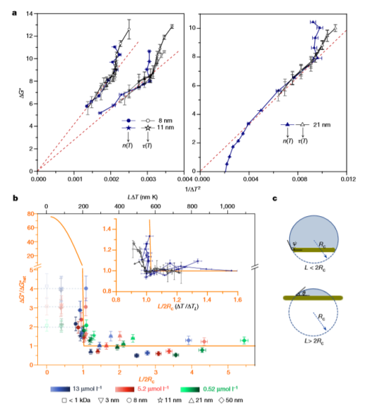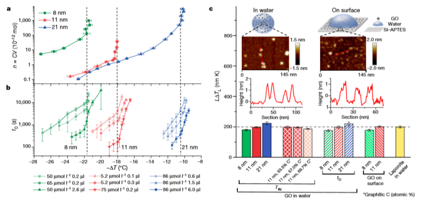 水的凍結(jié)現(xiàn)象無(wú)處不在,并影響著氣候,化學(xué)工業(yè),低溫生物學(xué)和材料科學(xué)等各個(gè)領(lǐng)域。冰的成核是水凍結(jié)過(guò)程中的關(guān)鍵步驟,近一個(gè)世紀(jì)以來(lái),人們一直認(rèn)為臨界冰核的形成是這一成核步驟的必要條件。但是,由于這種冰核轉(zhuǎn)瞬即逝和其納米性質(zhì),因此沒(méi)有直接的實(shí)驗(yàn)證據(jù)可以證明這種冰核的存在。在這里,我們報(bào)道了在具有可控尺寸的氧化石墨烯納米片水滴中冰成核現(xiàn)象,并顯示只有在一定的尺寸以上才能對(duì)冰的成核有顯著的影響,該尺寸隨液滴的過(guò)冷程度而變化。根據(jù)實(shí)驗(yàn)數(shù)據(jù)和理論計(jì)算推斷,氧化石墨烯的臨界尺寸反映了臨界冰核的大小,在足夠大的氧化石墨烯的情況下,臨界冰核位于其表面,并產(chǎn)生與經(jīng)典成核理論一致的成冰行為。相反地,若氧化石墨烯的尺寸小于臨界冰核尺寸時(shí),釘扎在氧化石墨烯的外圍會(huì)使冰核隨著其生長(zhǎng)而變形。這為成核作用提供了更高的自由能壘,并抑制了氧化石墨烯的促進(jìn)作用。這些結(jié)果提供了關(guān)于臨界冰核的存在和與溫度有關(guān)的尺寸的實(shí)驗(yàn)信息,而這些以前僅在理論上和通過(guò)模擬進(jìn)行了探索。由于將臨界前核固定在納米顆粒邊緣上并不是石墨烯氧化物上的冰核所特有的,因此我們希望該方法可以擴(kuò)展到探測(cè)其他成核過(guò)程中的臨界核。