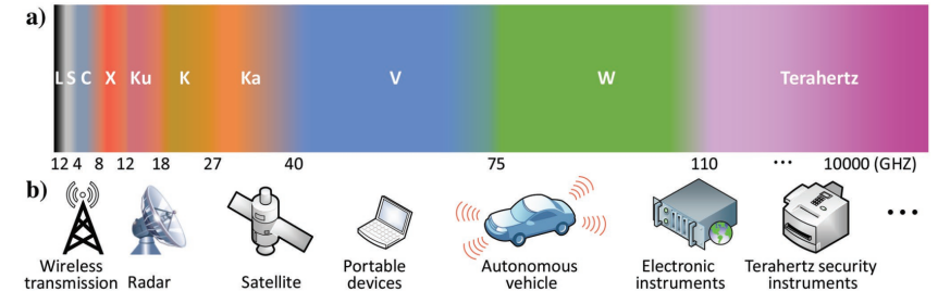 Figure 1. a)相應頻段電磁頻譜范圍的通用定義;b)在現(xiàn)代社會中廣泛使用的各種微波和太赫茲設備。