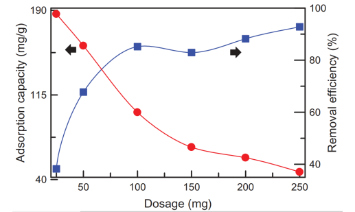 Figure 2. 樣品質(zhì)量對(duì)GO-MS樣品吸附能力和去除效率的影響