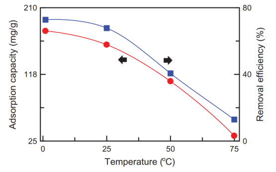 Figure 3. 溶液溫度對(duì)GO-MS樣品吸附容量和去除效率的影響