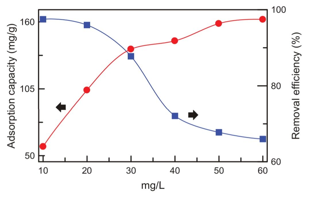 Figure 1. MB初始濃度對(duì)GO-MS樣品吸附能力和去除效率的影響